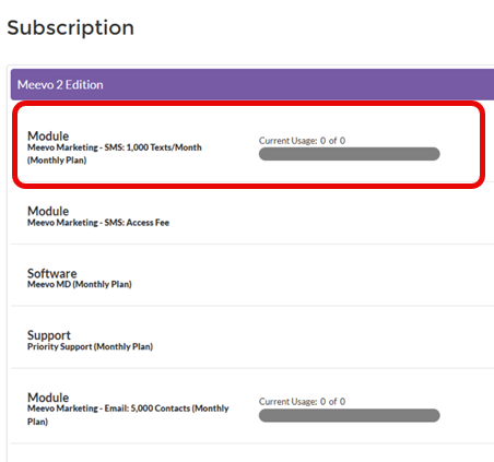 The text allotment information you see in Emma is not a true representation of your SMS Marketing text plan. To view your SMS Marketing usage and plan limits, go to the Plan/Subscription area of the MeevoXchange.