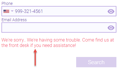 - Unsuccessful Check-In Message: This message displays if the client is unable to check in for any reason (for example, if the client attempt to check in too early or too late). The message remains there until the attempted phone number or email address is deleted.