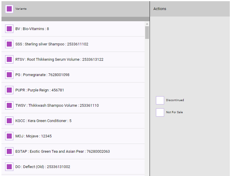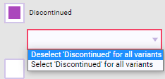 - Discontinued: Select the checkbox and then define the action: whether to deselect or select the Discontinued checkbox on all selected variants.