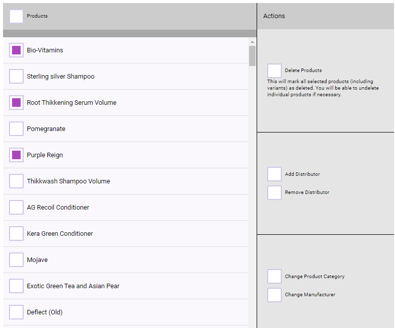 - Delete Products: Select the checkbox to delete all selected products and any of their associated variants. This also marks the products/variants as Discontinued. Since locations cannot delete CO-owned products, selecting this option updates results to locally-owned products only. Be sure to review the information below before you go forward with deleting a product.
