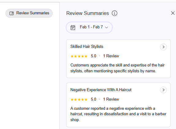 - Review Summaries are now available within Review Insights! These summaries are produced weekly or monthly (depending on your business’s review volume) to extract key insights from recent reviews, recommend which themes to look into, or suggest new themes to track.