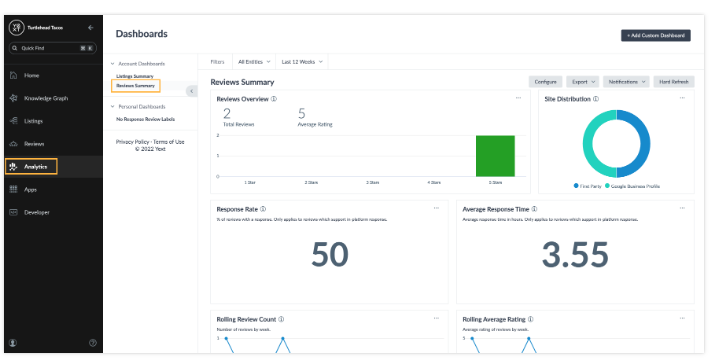 - An overview of key metrics shows you the most important metrics about your reviews and how they’ve changed over time. These include average rating, reviews volume, response time, and response rate. You can also view these metrics dimensioned by theme.