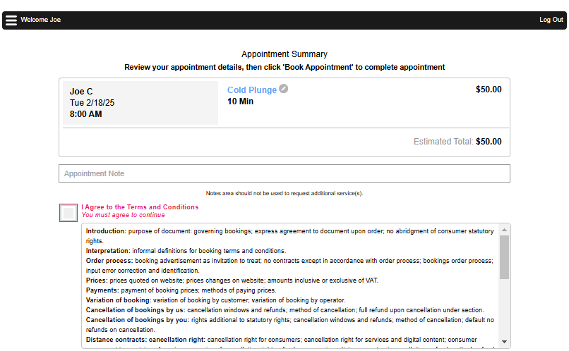 - Clients no longer agree to Terms & Conditions from the Client Registration form, making it easier for them to continue booking or make a purchase. Instead, clients will be presented with site-specific Terms & Conditions prior to finalizing a transaction (that is, prior to finalizing an appointment in Online Booking or making a purchase in eGift or Online Membership Sales).