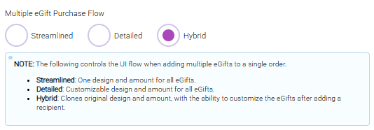 - New options allow your business to simplify the workflow when a client adds multiple eGifts to a single order. Businesses can select Streamlined (the simplest workflow), Detailed (the workflow with the most customization), or Hybrid (give the client the ability to customize as much or as little as they'd like). This bullet = Internal Only