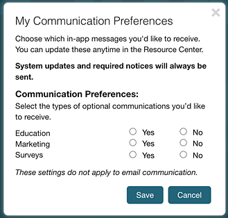 Preferences are set at the user level, and users can manage them at any time. Note that certain important announcements (such as an upcoming release or maintenance window) will override preferences, as will our NPS surveys.