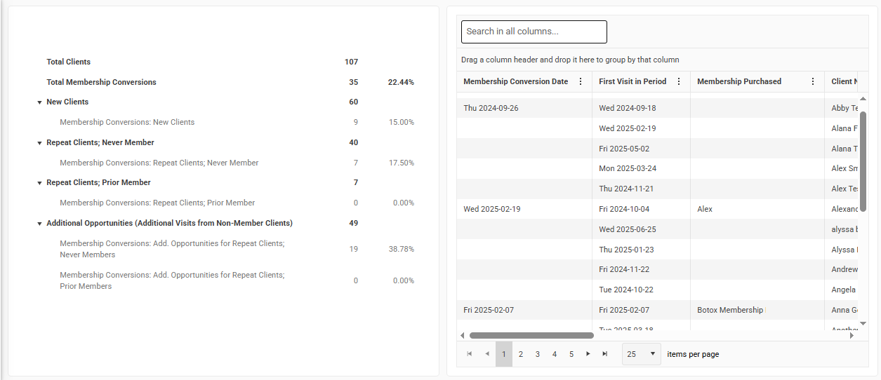 - Your overall conversion success: See the total number of non-member clients who visited during a selected period and how many of them converted to members after their service.