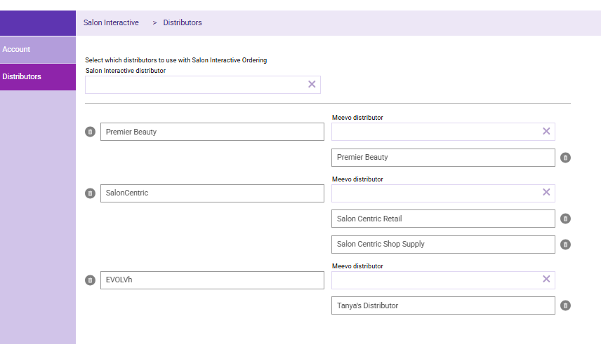 Next, you'll map your SalonInteractive distributors to their corresponding Meevo distributors, ensuring purchase orders route to the correct destination automatically.