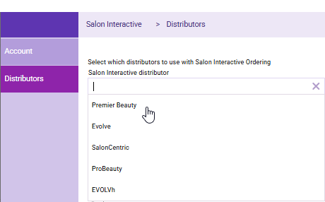 - From the drop-down, select a SalonInteractive distributor to add it to the list below. Only the distributors you're using in SalonInteractive will appear in this drop-down.