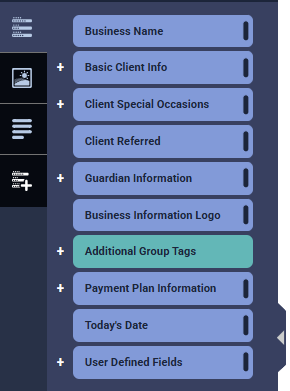 - The left column slideout is where you can view and add various elements to the form, such as tags and images. Elements can be added by double-clicking the tag or dragging-and-dropping the tag. Double-clicking or dragging the "parent" tag will add all of its sub-tags to the form.