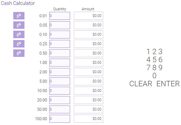 - Specify the Quantity of each denomination. When you do this, the Amount is automatically calculated.